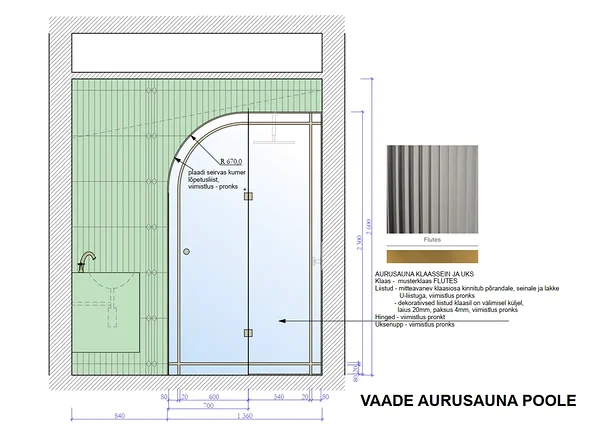 - Aurusauna klaassein ja uks, mis pidid vastama nõudliku sisekujunduse ja niiskuskindluse tingimustele.